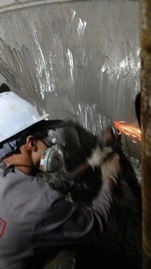 工人師傅在對脫硫塔內壁進行表面處理,這樣做的好處可以增強涂層與基材的結合力度,涂層不會開裂和脫落。